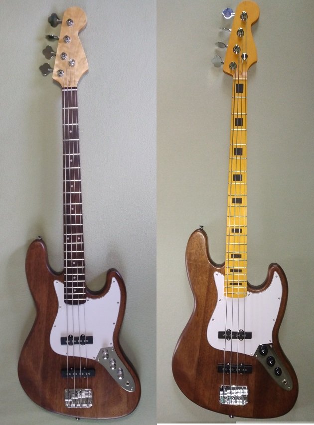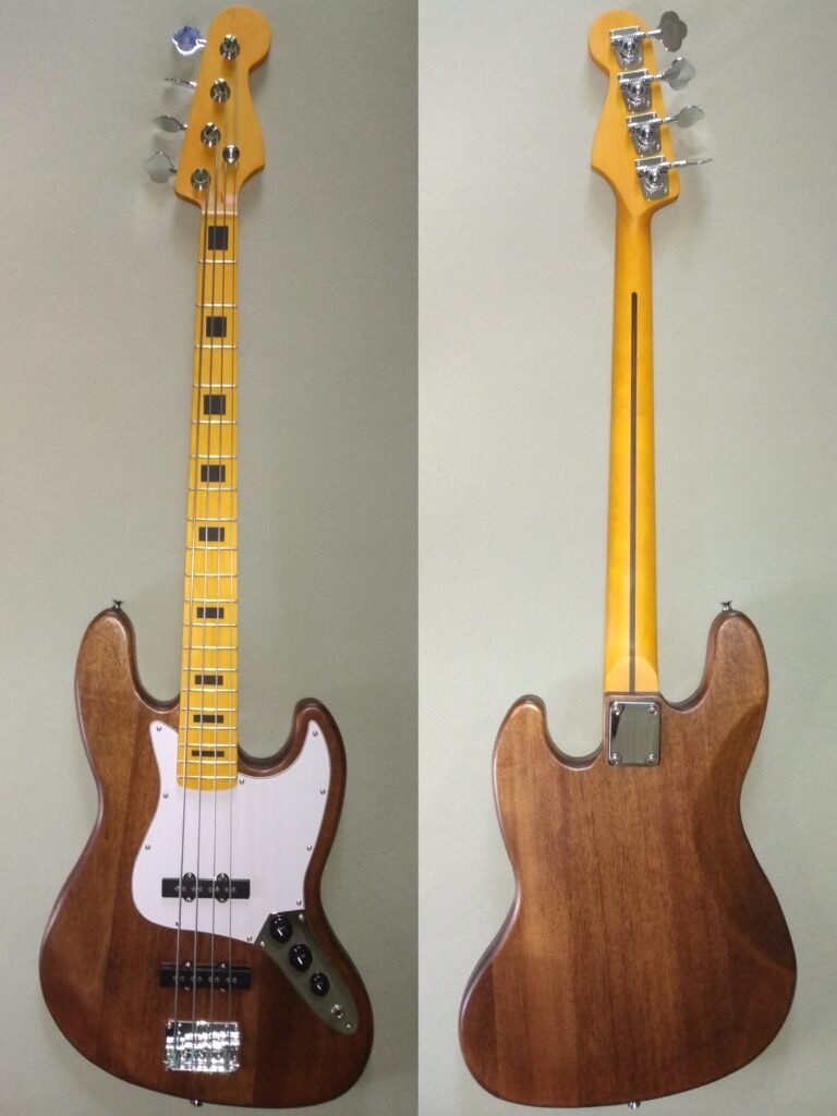 A while after I had this finished, I realized that even though this was a Jazz bass kit, the neck was more like a Precision bass and the width of the nut was 42mm. So I found a nice Canadian maple Jazz neck (38mm nut) on eBay and ordered it. Then I ordered a set of genuine Fender tuning machines from Sweetwater. I swapped out the neck and did a fresh setup. I also swapped out the original chrome knurled knobs for authentic Jazz bass knobs. Now I am completely satisfied with this bass.