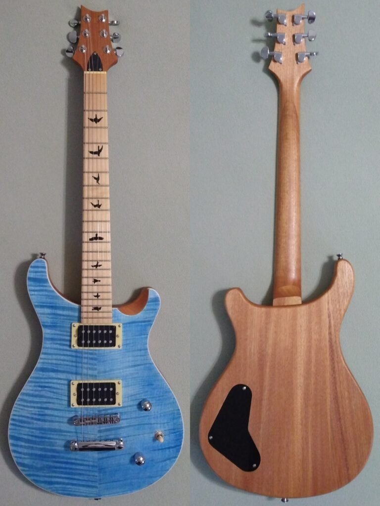 The body is mahogany, as is the neck, and it has a maple fingerboard complete with the signature PRS style bird inlays. I had to do a little shaping of the square headstock. It is my first set-neck project. The flamed maple top is finished with blue Keda wood dye and spray lacquer. The back, sides, neck and headstock are finished with Minwax Tung Oil, and the fingerboard is finished with Minwax wipe-on poly.